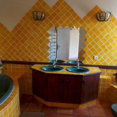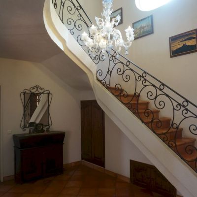 Stunning kitchen equipped with a Godin range cooker, a work surface made of enamelled lava enhanced by a stone fireplace from Bonifacio, a pantry, a service WC, a master bedroom, and its en-suite bathroom (double basin, multi-jet shower, and built-in bath).