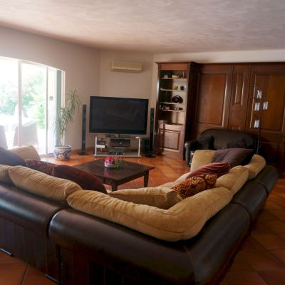 Very spacious living room and dining area leading to a second lounge with an office and library. The entire space, very bright, opens onto the outside through large bay windows.