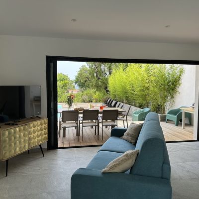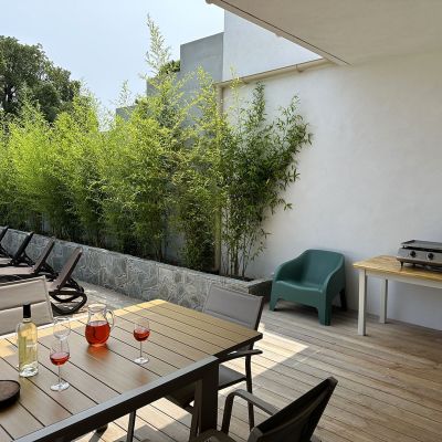 Cette villa offre le confort de la climatisation intégrale et une cuisine hautement fonctionnelle, entièrement équipée avec un four, un réfrigérateur de grande capacité, un micro-ondes, un lave-linge, un lave-vaisselle, et bien plus encore. De plus, la terrasse offre un accès direct à la cuisine, parfaite pour vos repas en plein air, agrémentés de délices concoctés sur la plancha.