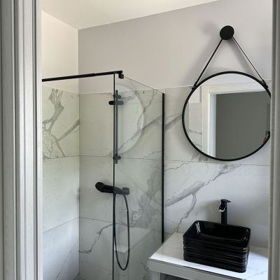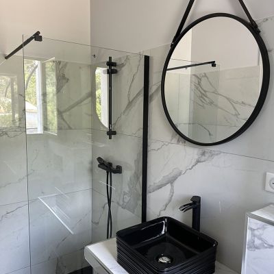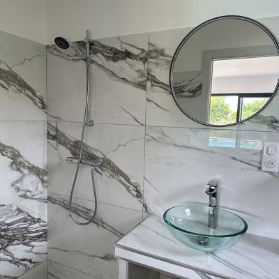 Au rez-de-chaussée, vous trouverez la chambre principale, bénéficiant d'une vue directe et d'un accès à la piscine, avec sa propre salle de bain pour un confort optimal.